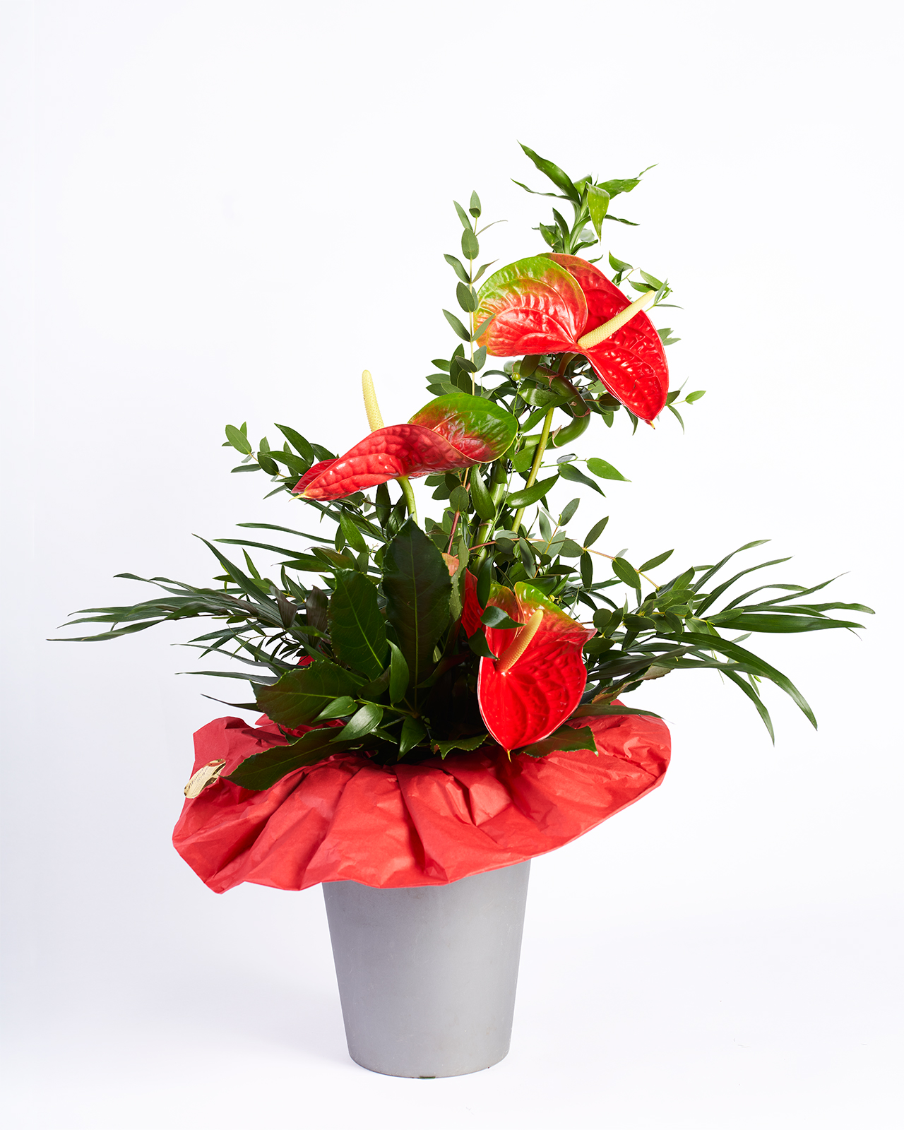 / Hochstrauß mit Anthurien in rot ( je nach Lagerung können Blumen und Farben variieren)